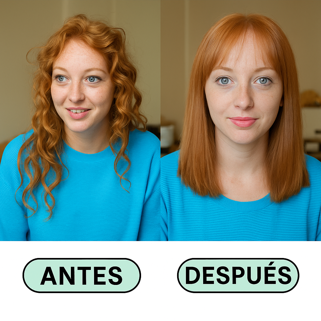 Antes: Tu cabello está seco, encrespado y sin vida. Pasas mucho tiempo tratando de alisarlo con la plancha, pero el calor daña tu pelo y los resultados no duran. El frizz se vuelve un problema constante y te sientes frustrada.
